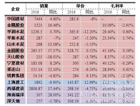 2016年,全國商品混凝土產(chǎn)量17.9億立方米,同比增長(zhǎng)7.4%,混凝土與水泥制品行業(yè)實(shí)現(xiàn)利潤總額658億元,同比增長(zhǎng)4.1%。從上市企業(yè)來看,14家由混凝土業(yè)務(wù)經(jīng)營的企業(yè)總銷量同比增長(zhǎng)6.25%,但由于大部分企業(yè)混凝土銷售價(jià)格出現(xiàn)回落,導(dǎo)致13家企業(yè)(除金隅股份)整體銷售收入同比只有1.25%的提升,而11家企業(yè)(除中國建材、金隅股份、山水水泥)整體毛利潤同比下滑3.3%。