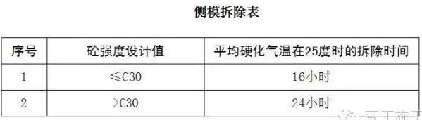 側(cè)模:在混凝土強(qiáng)度能保證表面棱角不因拆除模板而受損壞后,方可拆除。