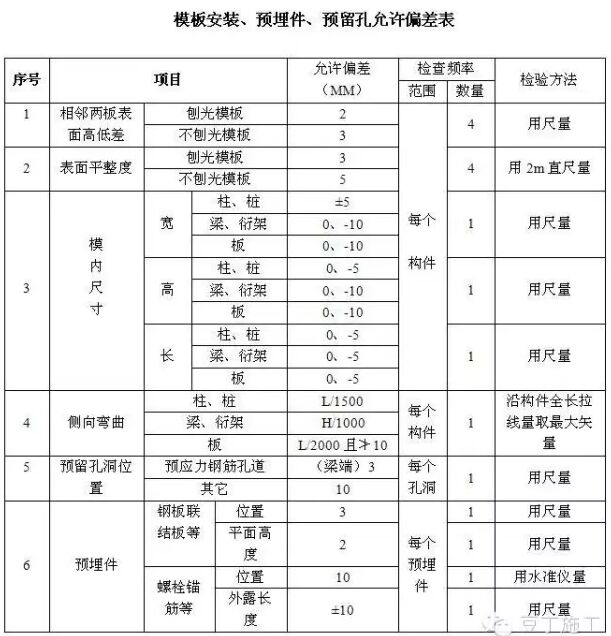 模板安裝、預(yù)埋件及預(yù)留孔施工允許偏差見《模板安裝、預(yù)埋件、預(yù)留孔允許偏差表》