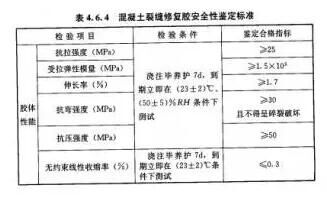 對于裂縫修補材料來說,其材料的安全性能指標,必須符合GB50728-2011《工程結(jié)構(gòu)加固材料安全性鑒定技術(shù)規(guī)范》的規(guī)定: