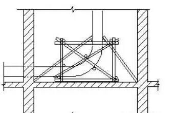 1.泵管隨層接,澆注墻體及柱混凝土?xí)r,端頭軟管放在該施工位置的操作架上,輸送管路必須使?jié)补嗖课辉诠ぷ靼霃街畠?nèi)。由于留洞口到操作位置需接90o彎管和平直管,保證平直管高出模板頂1M,彎管及平直管必須臨時(shí)固定牢固,搭設(shè)類似前圖所示的固定架子,保證泵管穩(wěn)定。