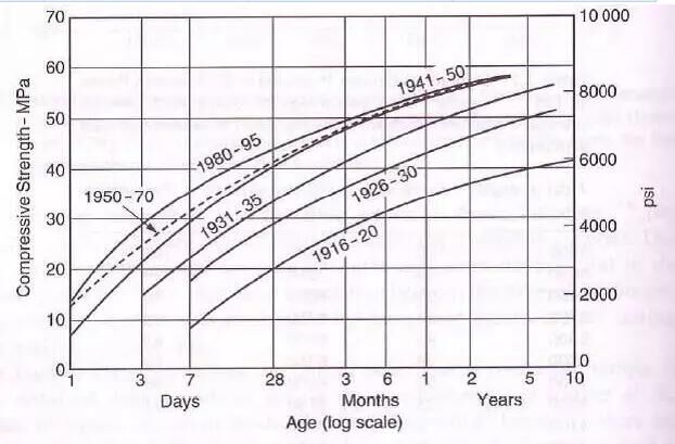 現(xiàn)在水泥與100年前水泥不相同大了去了。現(xiàn)有很多高強水泥可采用高C3S、低C2S,高細(xì)度的方式實現(xiàn)早期高強目標(biāo)。盡管使用“高強水泥”可以降低規(guī)定強度的水泥用量、加快拆模、加速工程進度而使建設(shè)總承包方獲取豐厚利益,但是高水膠比和低水泥用量容易導(dǎo)致混凝土的滲透性較高,一般耐久性較差。過高早期強度和過早放棄模板的有效養(yǎng)護同樣對工程質(zhì)量產(chǎn)生安全隱患。