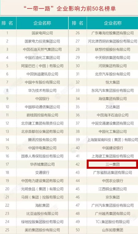 【企業(yè)】一帶一路”企業(yè)影響力官榜發(fā)布,三一上榜