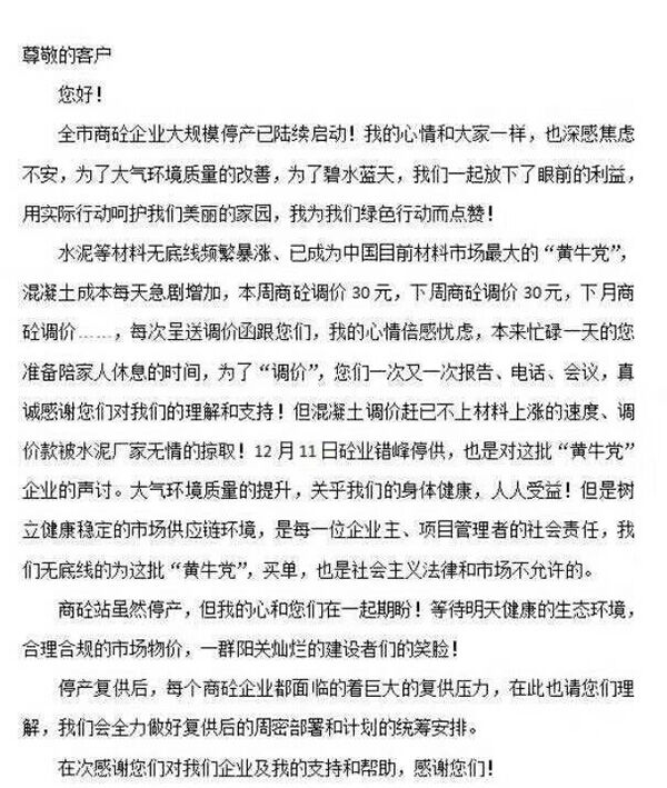 決議除了請求政府干預價格之外,還要求會員單位堅決抵制因價格波動采取惡意低價競爭搶占市場的行為;要求會員單位與施工單位及時溝通,在雙方因價格調(diào)整未達成一致且合同未終止前,其他企業(yè)一律不得低價介入;要求各片區(qū)響應政府環(huán)保要求,及時采取錯峰生產(chǎn)、停產(chǎn)限產(chǎn)等措施。