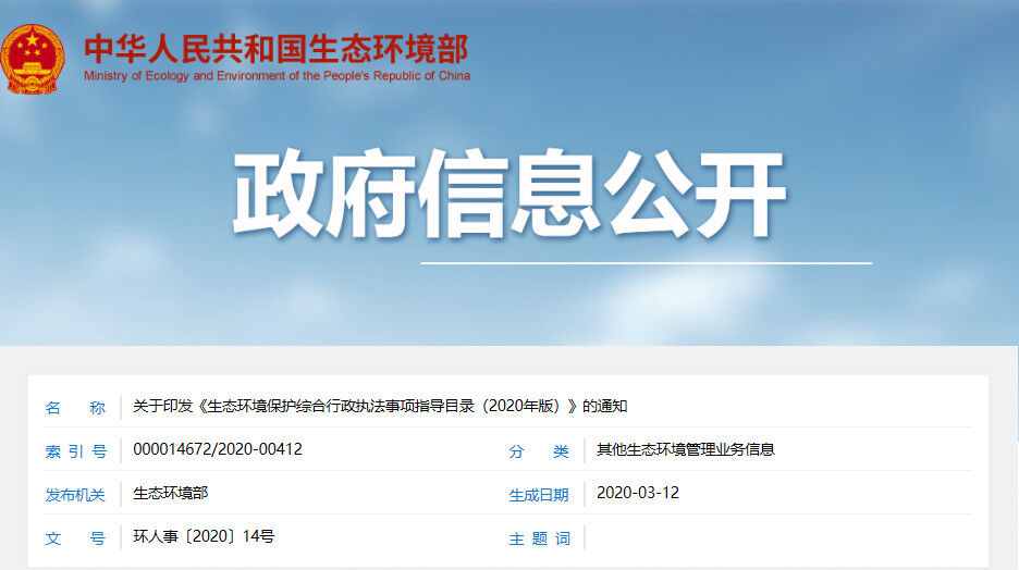 近日,生態(tài)環(huán)境部發(fā)布了關(guān)于印發(fā)《生態(tài)環(huán)境保護綜合行政執(zhí)法事項指導(dǎo)目錄(2020年版)》(以下簡稱“《指導(dǎo)目錄》”)的通知,稱根據(jù)深化黨和國家機構(gòu)改革有關(guān)安排部署,為貫徹落實《國務(wù)院辦公廳關(guān)于生態(tài)環(huán)境保護綜合行政執(zhí)法有關(guān)事項的通知》(國辦函〔2020〕18號)要求,扎實推進生態(tài)環(huán)境保護綜合行政執(zhí)法改革,現(xiàn)印發(fā)《生態(tài)環(huán)境保護綜合行政執(zhí)法事項指導(dǎo)目錄(2020年版)》及說明。