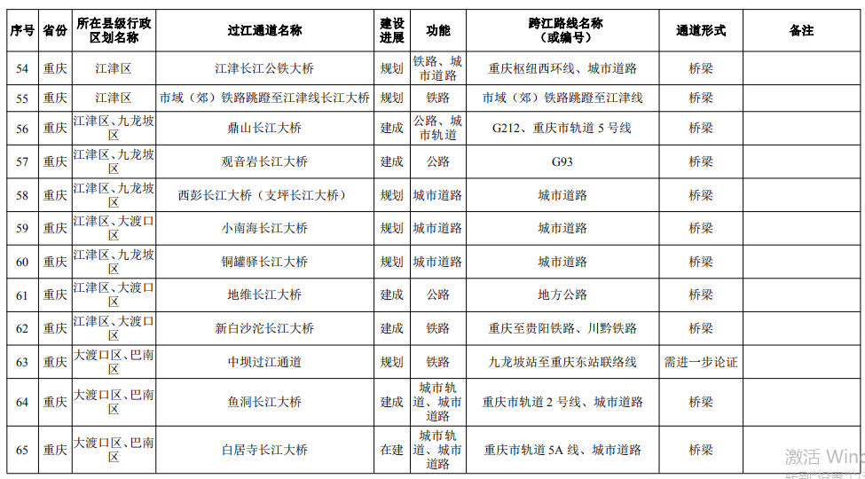 重慶市(17座):市域(郊)鐵路跳蹬至江津線長江大橋、西彭長江大橋(支坪長江大橋)、小南海長江大橋、中壩過江通道、黃桷坪長江大橋、軌道27號線過江通道、重慶至黔江鐵路過江通道、黃桷沱大橋、長壽長江三橋、涪陵石沱長江大橋、涪陵龍頭港長江大橋、涪陵江北長江大橋、興義長江大橋、西沱長江大橋、云陽復興長江大橋、奉節(jié)二橋、巫山長江二橋