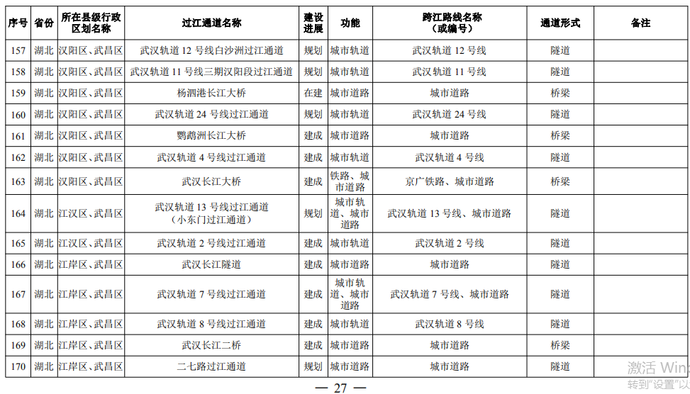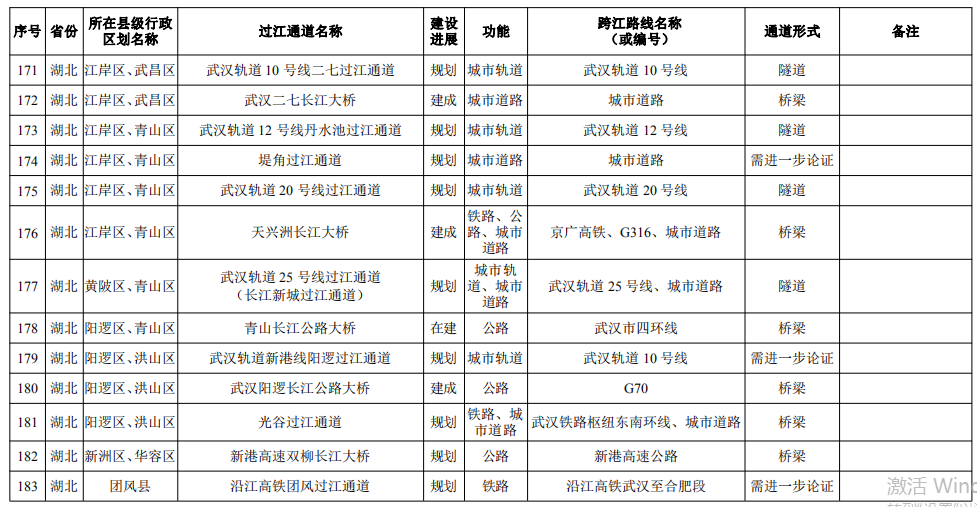 湖北?。?4座):巴東長江公路二橋、興山至長陽高速公路過江通道、宜昌東艷路過江通道、宜都紅花套過江通道、枝江百里洲長江大橋、李埠長江公鐵大橋、觀音寺長江大橋、武漢都市區(qū)環(huán)線漢南過江通道、軍山長江二橋、武漢軌道17號線過江通道(青菱過江通道)、武漢白沙洲過江通道、武漢軌道12號線白沙洲過江通道、武漢軌道11號線三期漢陽段過江通道、武漢軌道13號線過江通道(小東門過江通道)、二七路過江通道、武漢軌道10號線二七過江通道、武漢軌道12號線丹水池過江通道、堤角過江通道、武漢軌道20號線過江通道、武漢軌道25號線過江通道(長江新城過江通道)、武漢軌道新港線陽邏過江通道、光谷過江通道、新港高速雙柳長江大橋、鄂黃第二過江通道鄂湘界(1座):監(jiān)利至華容公鐵兩用大橋