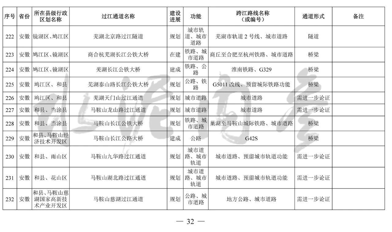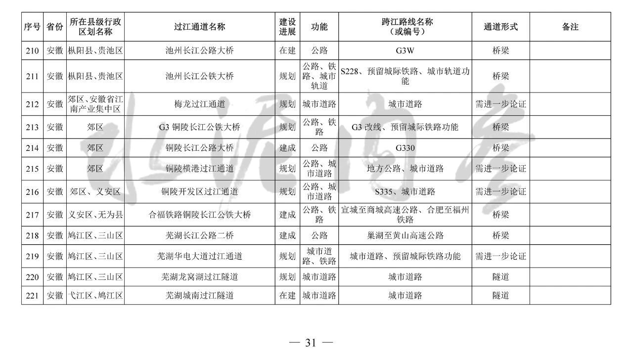 安徽省(9座):望江長江公鐵大橋、安慶??陂L江公路大橋、池州長江公鐵大橋、G3銅陵長江公鐵大橋、銅陵開發(fā)區(qū)過江通道、蕪湖北京路過江隧道、蕪湖泰山路長江公鐵大橋、馬鞍山長江公鐵大橋、馬鞍山九華路過江通道