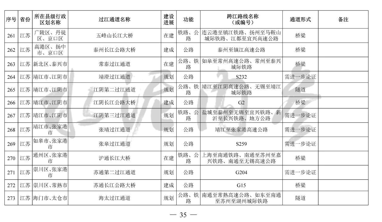 江蘇?。?3座):錦文路過江通道、南京地鐵4號線過江通道、南京市域快速軌道過江通道、南京上元門過江通道、南京七鄉(xiāng)河過江通道、龍?zhí)堕L江大橋、寧儀城際鐵路過江通道、潤揚第二過江通道、江陰第二過江通道、江陰第三過江通道、張皋過江通道、蘇通第二過江通道、海太過江通道