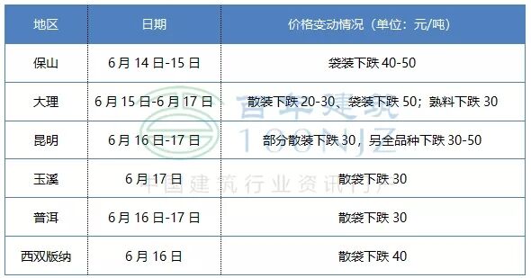 17日云南玉溪、大理地區(qū)部分品牌水泥價(jià)格下跌30元/噸,雨水天氣市場需求不佳,價(jià)格回落。