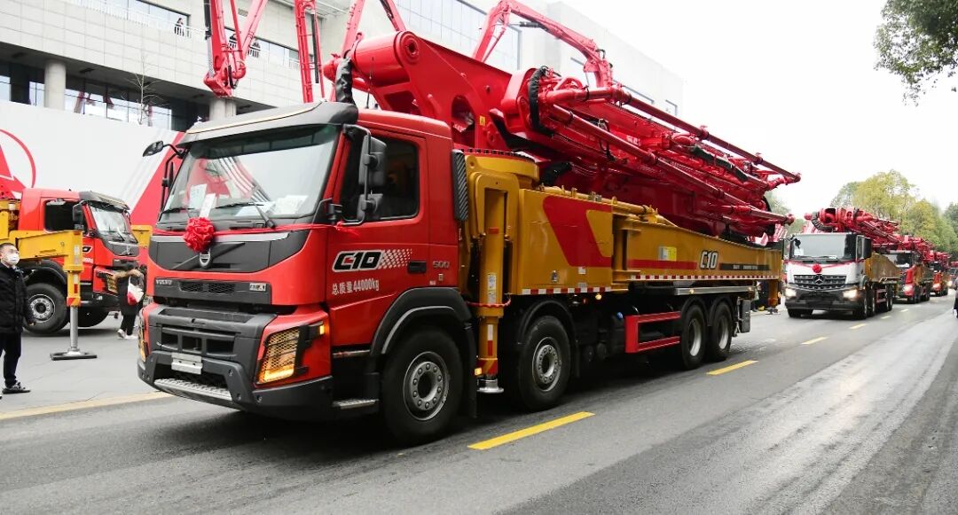 長沙廠區(qū)主干道上,66臺“世界泵王”整裝待發(fā),接受現場各位領導和來賓的檢閱。本次發(fā)貨的產品涵蓋37米、43米、56米等多款明星產品,更有S系列泵車的大力加持,大部分為國六新品。