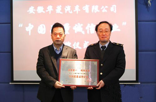 摘要:近日,受中國檢驗檢疫協(xié)會委托,安徽檢驗檢疫協(xié)會專程來到華菱星馬,向安徽華菱汽車有限公司頒發(fā)“中國質量誠信企業(yè)”牌匾。