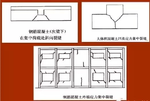 裂縫一般特征: 應(yīng)力集中裂縫一般發(fā)生在門(mén)窗洞口的角部和平立面突出凹進(jìn)的轉(zhuǎn)角處,且斜向楔形狀裂縫居多。在集中荷載較大的部位,易產(chǎn)生劈裂狀的裂縫。在預(yù)應(yīng)力結(jié)構(gòu)錨固端的局部承壓處,有時(shí)出現(xiàn)一條或數(shù)條裂縫,并呈放射形狀。