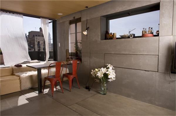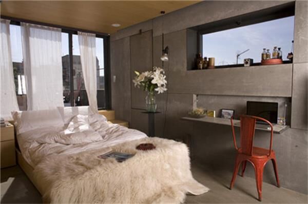 床的亮點設(shè)計在于它是可以伸縮的。白天可以推進(jìn)去,這里充當(dāng)飄窗的作用。墻面也是頗有創(chuàng)意和實用性,隱藏在墻上的混凝土板,拉下來變成方便的書桌或是餐桌。