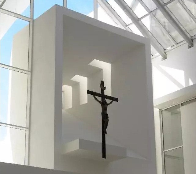 理查德·邁耶作品。教堂高57~90尺不等,如船帆狀的三片白色弧墻,層次井然地朝垂直與水平雙向彎曲,似球狀的白色弧墻曲面。建筑材料包括混凝土、石灰華和玻璃。三座大型的混凝土翹殼高度從56英尺逐步上升到88英尺,看上去像白色的風(fēng)帆。玻璃屋頂和天窗讓自然光線傾瀉而下。夜晚,教堂的燈光營造出一份天國的景觀。