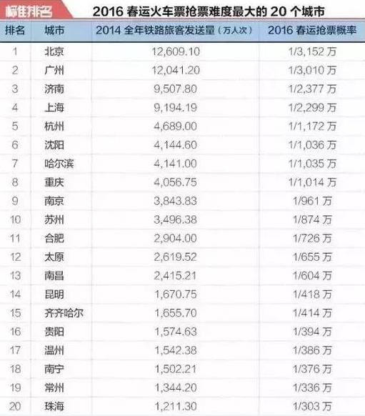 按照以上方法,標(biāo)準(zhǔn)排名在50個(gè)城市的數(shù)據(jù)基礎(chǔ)上,統(tǒng)計(jì)出了“2016春運(yùn)火車(chē)票搶票難度最大的20個(gè)城市”。其中,擁有大量外來(lái)人口的北京,當(dāng)仁不讓成為了出發(fā)地最難買(mǎi)票的城市;打工圣地廣州,位列第二;濟(jì)南作為人口大省山東的省會(huì),位列第三;上海和杭州緊隨其后,位列第四和第五;沈陽(yáng)、哈爾濱、重慶、南京、蘇州、合肥、太原、南昌、昆明、齊齊哈爾、貴陽(yáng)、溫州、南寧、常州和珠海分別進(jìn)入前20強(qiáng),入榜城市鐵路旅客發(fā)送量均超過(guò)1000萬(wàn)人次。