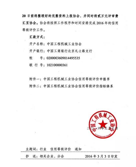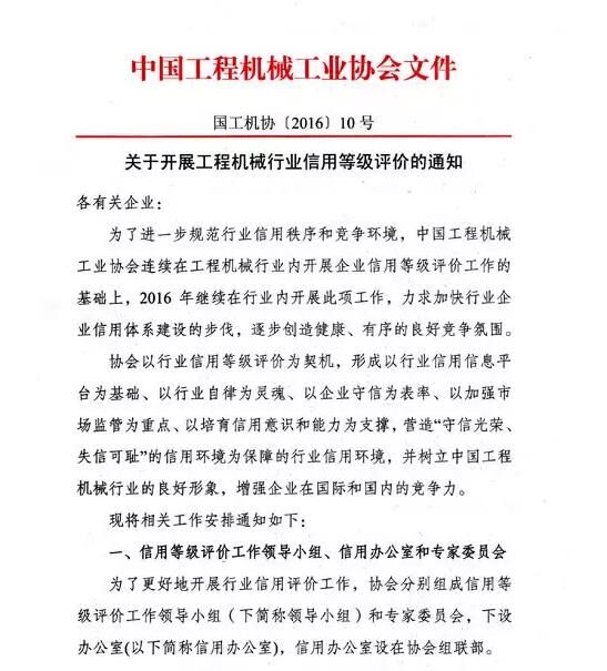 為了進(jìn)一步規(guī)范行業(yè)信用秩序和競爭環(huán)境,中國工程機(jī)械工業(yè)協(xié)會(huì)連續(xù)在工程機(jī)械行業(yè)內(nèi)開展企業(yè)信用等級(jí)評價(jià)工作的基礎(chǔ)上,2016年繼續(xù)在行業(yè)內(nèi)開展此項(xiàng)工作,力求加快行業(yè)企業(yè)信用體系建設(shè)的步伐,逐步創(chuàng)造健康、有序的良好競爭氛圍。