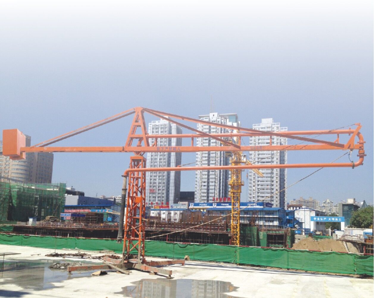 河南金源布料機(jī)桿采用回轉(zhuǎn),臂架式布料結(jié)構(gòu),配用125MM輸送管,360度回轉(zhuǎn),整機(jī)手動(dòng)操作。具有結(jié)構(gòu)簡(jiǎn)單,強(qiáng)度、剛性可靠,操作簡(jiǎn)單,靈活,維修方便等特點(diǎn),與混凝土泵配套使用可廣泛的應(yīng)用于民用與工業(yè)建筑的混凝土澆注工程中