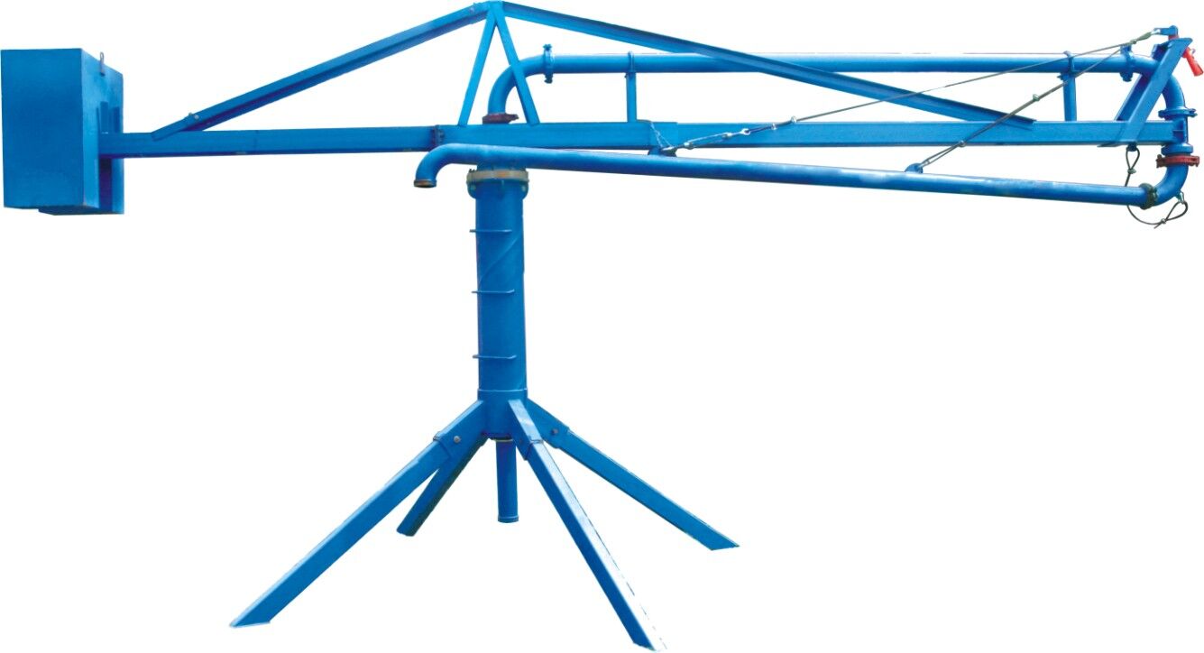 結(jié)構(gòu):、插銷(xiāo)、立架、構(gòu)成的底座是固定部分,其上通過(guò)回轉(zhuǎn)支承與上部回轉(zhuǎn)部分相連,上主梁架、平衡臂、平衡臂架拉桿、上橫桿組成后回轉(zhuǎn)部分。立管上有回轉(zhuǎn)卡篐接頭。通過(guò)人力拉動(dòng),可使整個(gè)回轉(zhuǎn)部分回轉(zhuǎn)360度。上梁主架前端連接有一個(gè)回轉(zhuǎn)支座與前橫桿、前拉桿組成前回轉(zhuǎn)部分,在人力拉動(dòng)下可繞回轉(zhuǎn)支座旋轉(zhuǎn)300度。由兩部分回轉(zhuǎn)架組成的合成運(yùn)動(dòng)就能覆蓋所有布料半徑范圍的布料點(diǎn)。