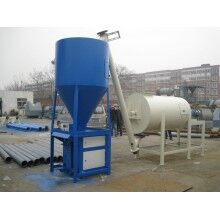 過傳感器的數(shù)據(jù)反饋,實現(xiàn)原料計量。計量好后的物料,通過螺旋輸送機導(dǎo)進主斗提機,提升到混合機上部待混料倉中。待混倉為氣動大開門型,可以迅速將待混物料放入無重力