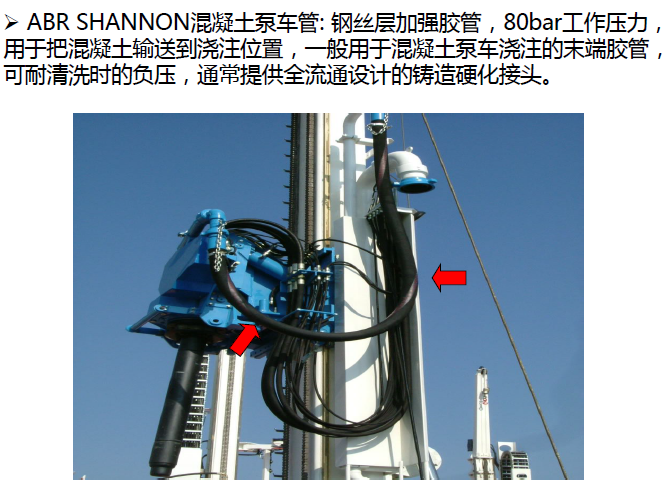 應(yīng)用范圍: 鋼絲層加強(qiáng)膠管,85bar 工作壓力,用于把混凝土輸送到 澆注位置;一般用于混凝土泵車澆筑的末端膠管,管子可以耐清 洗時(shí)的負(fù)壓,通常提供全流通設(shè)計(jì)的鍛造硬化接頭