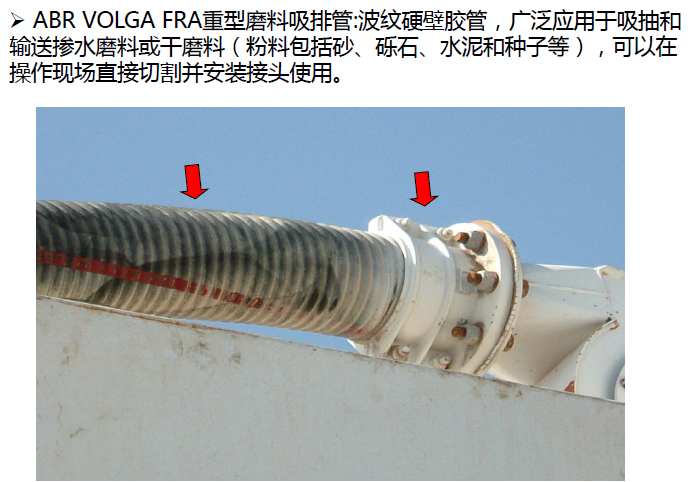 應(yīng)用范圍: 波紋硬壁膠管,廣泛用于吸抽和輸送摻水磨料或者只是粉 塵(砂,礫石,水泥,種子等), 可以在操作現(xiàn)場(chǎng)直接切割并安裝 接頭使用