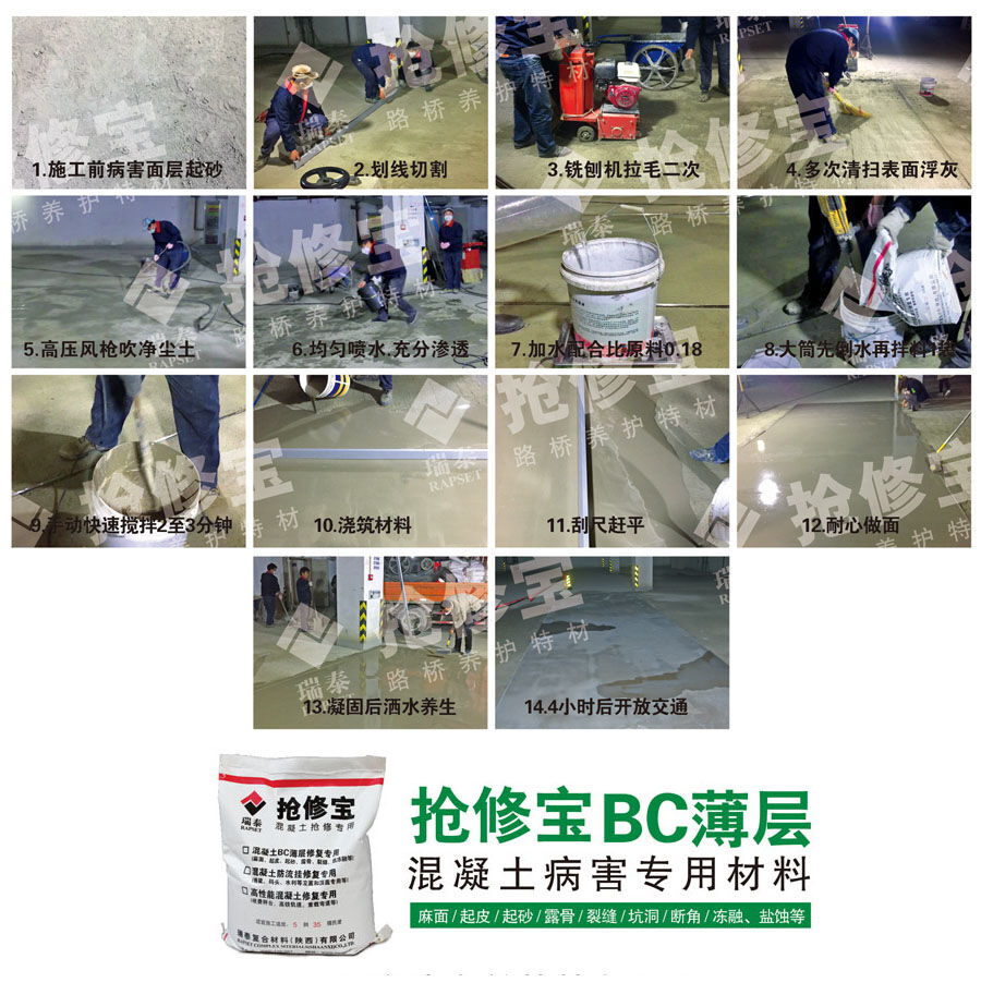 出現(xiàn)這些問題的主要原是因?yàn)槭┕べ|(zhì)量和產(chǎn)品本身的使用壽命問題,那么針對(duì)這種問題,地坪在修補(bǔ)處理基層時(shí)應(yīng)該選擇什么材料呢?首先應(yīng)考慮快速材料,因?yàn)槭堑叵峦\噲?chǎng),車輛需要頻繁進(jìn)入駛出;其次針對(duì)起塵、起砂、脫落的微表處病害,選擇針對(duì)微表處病害的修補(bǔ)材料。搶修寶BC薄層就是一個(gè)不錯(cuò)的選擇,材料本身強(qiáng)度高,內(nèi)含進(jìn)口膠粉,可以和病害部位嚴(yán)絲合縫的結(jié)合起來,其次加入了進(jìn)口添加劑,材料可以30分鐘完成初凝,2-4小時(shí)就可以恢復(fù)交通,解決了車輛進(jìn)出頻繁引起的交通擁堵,是地坪修補(bǔ)基層處理的的不錯(cuò)的選擇!