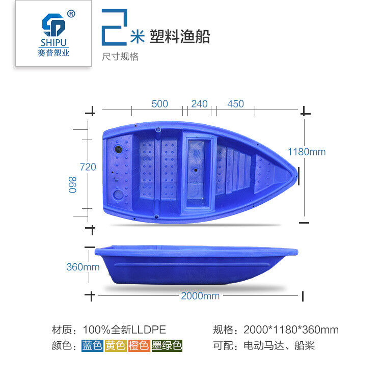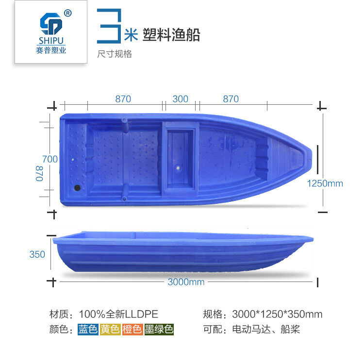 3.本公司專業(yè)生產(chǎn)的塑料漁船,是為水產(chǎn)養(yǎng)殖戶量身定做的,采用進口韓國LLDPE材質(zhì),具有很強的抗老化性,保證船的使用壽命在20年以上。一次成型,無縫焊接。顏色可改。船身都是雙層的質(zhì)量更好浮力更大 目前所有的塑料船都打上了泡沫。