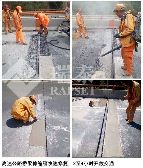 養(yǎng)護(hù)人員到達(dá)現(xiàn)場(chǎng),對(duì)破損混凝土進(jìn)行鑿除,將伸縮縫內(nèi)部斷裂的鋼筋電焊連接好,然后將搶修寶材料按照一定的水灰比攪拌均勻,澆筑于伸縮縫坑槽內(nèi),用振搗棒進(jìn)行適當(dāng)振搗,然后迅速收面,初凝后,開始灑水養(yǎng)生,2小時(shí)后,完全可以通行。目前,所有路段均已施工修復(fù)完畢。產(chǎn)品品質(zhì)以及材料實(shí)用性獲得了局領(lǐng)導(dǎo)以及養(yǎng)護(hù)工人的一致好評(píng)。