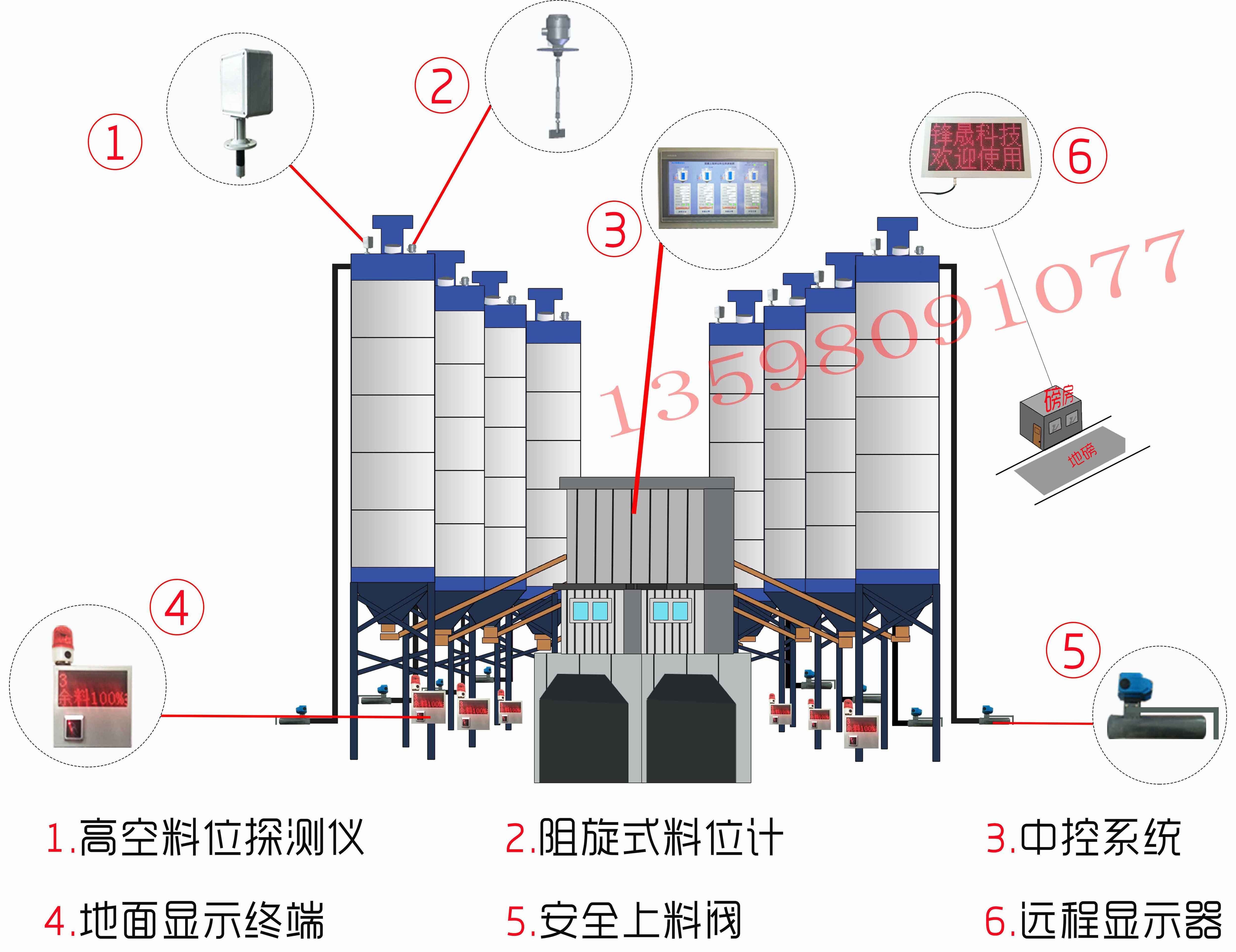 攪拌站料倉安全系統(tǒng)主要由高空料位探測儀、阻旋式料位計(jì)、中控系統(tǒng)、地面顯示終端、安全上料閥以及遠(yuǎn)端顯示器組成。該料位測量系統(tǒng)具有安裝簡單、維護(hù)方便、測量精準(zhǔn)、使用安全性高、安裝過程中不需要停產(chǎn)等優(yōu)勢,是防止水泥罐冒倉的實(shí)時(shí)測量水泥倉物料面的料位測量系統(tǒng)。