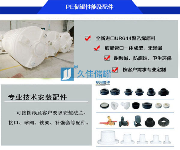 特點:所用材質為韓國進口聚乙烯(PE)滾塑原料,儲罐一次成型,內(nèi)外光滑,無焊接縫、不滲漏、具有良好的衛(wèi)生性與抗紫外線能力,耐酸堿、耐腐蝕、易清洗、不易老化、抗沖擊。它可以盛裝在常溫下無機酸、堿、鹽等大部分物質及有機物,耐熱耐凍性佳,在-5℃—+60℃均可使用。
