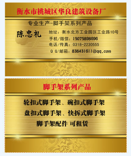 衡水水市桃城區(qū)華良建筑設(shè)備廠聯(lián)系電話:150-7589-8696。省力輪扣式腳手架具有拼拆迅速、省力,結(jié)構(gòu)簡(jiǎn)單、穩(wěn)定可靠,通用性強(qiáng),承載力大,安全高效,不易丟失,便于管理,易于運(yùn)輸?shù)忍攸c(diǎn)。