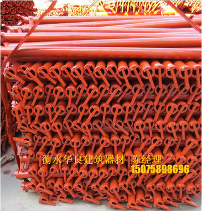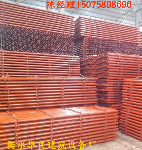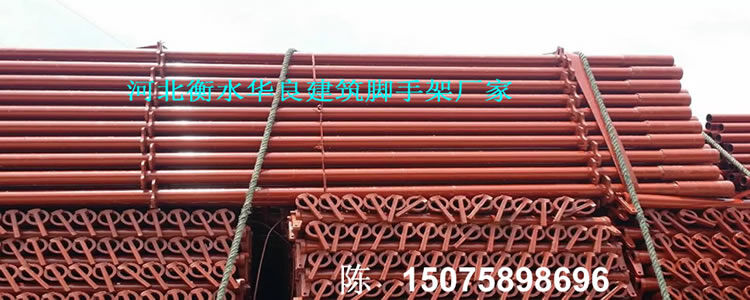 河北衡水華良建筑器材聯(lián)系電話:150-7589-8696 ,輪扣腳手架、碗扣腳手架、快拆式腳手架、承插式新型腳手架、直插式腳手架、鋼管腳手架、建筑腳手架,新型建筑支撐,腳手架,模板支撐,新型模板支撐, 新型建筑支撐。這種新型材料的特點(diǎn)是:耐腐蝕,彈性大,堅(jiān)固不變形。易搭拆腳手架,施工速度快的腳手架。 每根支撐桿可以支撐3-4噸左右,兩根主龍脊之間可以承重2-2.5噸的重量,每根副龍脊可以承重1噸?,F(xiàn)在工地現(xiàn)澆水泥一般厚度也就是10-15厘米,同等面積重量最多100-150公斤,所以這個支撐力度一般高層建筑完全夠用。