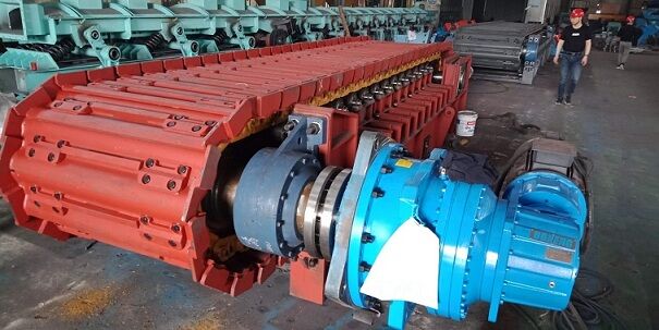 鏈板組件直接承受礦倉物料壓力和運送物料。鏈板組件由輸送板、牽引鏈軌及其聯(lián)接螺栓組成。輸送板采用搭接式結(jié)構(gòu)。輸送板材質(zhì)為高錳鋼,鑄造成型,相互搭接,輸送板用螺栓固定在鏈軌上。這種板不僅重量輕、不漏礦,而且強度高、耐磨損、抗沖擊。