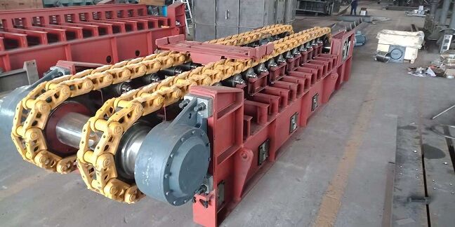 座部件由機架和支承件組成。機架由鋼材焊接而成,支承部件有支重輪、下托輪和縱向?qū)к?,輸送板得到支重輪和縱向?qū)к壍碾p重支持,使支重更均勻合理。牽引鏈基本上不受礦石和自重產(chǎn)生的張力作用,支重輪外側(cè)設(shè)計有凸臺,與主、從動輪聯(lián)合作用,成功地杜絕鏈軌跑偏。在機架下方設(shè)有下托輪,為方便維修,下托輪為側(cè)裝式。