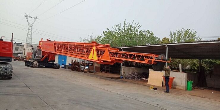 該機質(zhì)量達到了118噸,主輸送皮帶在水平狀態(tài)下,最遠輸送距離是60米,其工作角度在向下輸送15°和向上輸送30°的范圍內(nèi),如果工作角度太大,被輸送物料或者混凝土會因為重力作用導致堆料。所以,相比較泵車來說,這種車載伸縮式皮帶輸送機的工作高度有限。它的最大輸送高度只有34.7米。