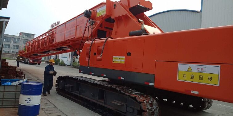 我公司生產(chǎn)的可移動式混凝土運(yùn)輸、澆筑設(shè)備——自行帶式混凝土布料機(jī),小時澆筑強(qiáng)度可達(dá)270m3。為了解決混凝土布料機(jī)的供料問題,自行研制了可移動式上料平臺。