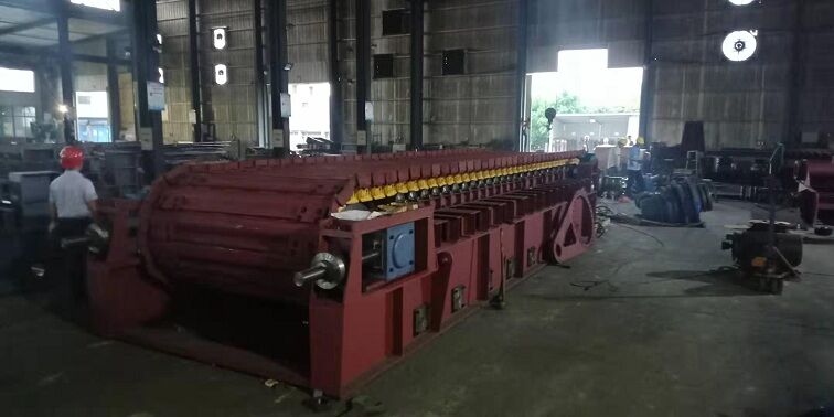 2)經(jīng)過浮選機進行浮選的金礦粉料,加入了浮選藥劑,物料濕度較大,有粘性,同時有可能結(jié)成塊狀。由于物料的特殊性這道工序的配套輸送設(shè)備比較關(guān)鍵:料斗一次抓料十多噸,物料對輸送機有較大的沖擊力。所以這道工序選擇的輸送機要能承受物料沖擊,也要能輸送粘性物料,同時該輸送機具有打散功能,把結(jié)成塊的物料打散。這道工序的輸送機通常采用我公司研制的新型皮帶板式給料機,可滿足以上要求。