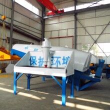落地式砂石分離機(jī)整套系統(tǒng)主要由:攪拌車(chē)加水清洗裝置,溜槽裝置,砂石漿水分離裝置,和泥漿水后處理裝置組成?;炷凛斔驮O(shè)備清洗后,將殘余混凝土排入溜槽中,在高壓水流沖擊下,經(jīng)溜槽進(jìn)入砂石分離機(jī),在不斷旋轉(zhuǎn)的分離機(jī)作用下,對(duì)混凝土進(jìn)行充分的清洗,同時(shí)將砂石、漿水進(jìn)行分離,分離后的砂、石在導(dǎo)料葉片的作用下背向流動(dòng)至出料口排出分離機(jī)落入振動(dòng)篩分機(jī),通過(guò)篩分將沙、石子分開(kāi),分別堆放。清洗后的漿水從分離機(jī)的溢水口排出進(jìn)入濃漿池,經(jīng)污水泵加壓打到旋流器除去多余固體微粒,降低漿水濃度,進(jìn)入攪拌池回收利用。進(jìn)入攪拌池的漿水為了防止沉淀凝固,需通過(guò)攪拌器的作用,攪拌器的工作為間歇式。分離出水泥漿在連續(xù)的攪拌器作用下,再通過(guò)高壓污水泵輸送到攪拌樓中待生產(chǎn)再利用。整個(gè)控制系統(tǒng)設(shè)有手動(dòng)和自動(dòng)控制,方便控制設(shè)置,整個(gè)系統(tǒng)運(yùn)行可靠,故障率低,維護(hù)量少等特點(diǎn)。