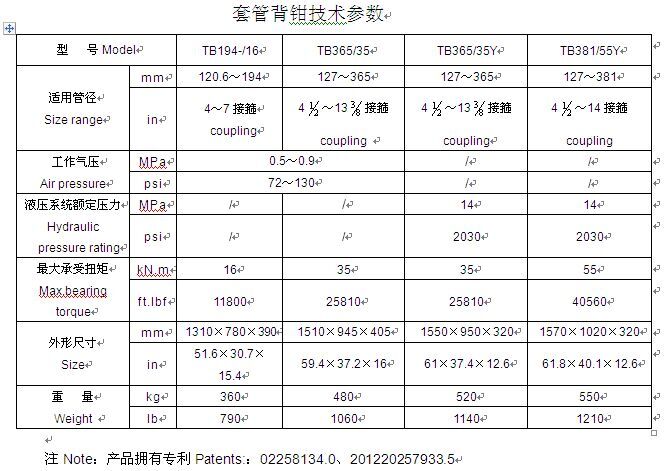 TB套管背鉗為專利產(chǎn)品,可與油田現(xiàn)使用的各類套管動力鉗配合進行下套管作業(yè),能提高管柱絲扣聯(lián)接質(zhì)量,減少主鉗大扭矩作業(yè)的變形,提高作業(yè)的安全性、可靠性,減輕工人勞動強度,提高作業(yè)效率。該產(chǎn)品按控制方式有全氣、液控兩種。設有扭矩傳感器,可精確測出管柱聯(lián)接的扭矩。表中為背鉗參數(shù)。動力鉗符合SY/T5074標準和API Spec 7K規(guī)范。