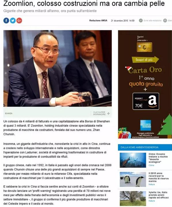 意大利知名國(guó)際通訊社安莎通訊社(Agenzia nazionalestampa associata,ANSA)今日在其網(wǎng)站首頁(yè)連續(xù)重磅發(fā)布三篇報(bào)道,聚焦中國(guó)企業(yè)中聯(lián)重科收購(gòu)意大利領(lǐng)先環(huán)保企業(yè)LADURNER(納都勒)公司,中聯(lián)重科董事長(zhǎng)詹純新,公司副總裁、環(huán)境集團(tuán)總裁張建國(guó)接受了安莎社記者的專(zhuān)訪。